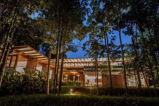 O programa, se desenvolve em aproximadamente 800,00m² distribuídos em dois pavilhões. O primeiro, denominado “social”, é acessado por uma ponte que leva o convidado da calçada ao centro do pavilhão. Feito em estrutura de madeiras certificadas com generosos beirais, projetados para proteger a casa do sol e chuva. Ao longo de toda a fachada, um muxarabi geométrico faz alusão as famosas rendas baianas, proporcionando privacidade aos moradores assim como entrada de luz e ventilação natural.